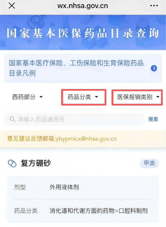 您也可以根据自己的需求,按“药品分类”或“医保报销类别”进行筛选查找。