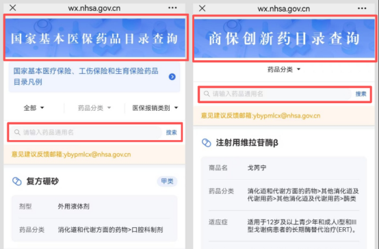 第二步:输入药品通用名,点击搜索,即可查看该药品是否在目录内、所属分类、报销类别(医保目录)或商保创新药目录相关信息。
