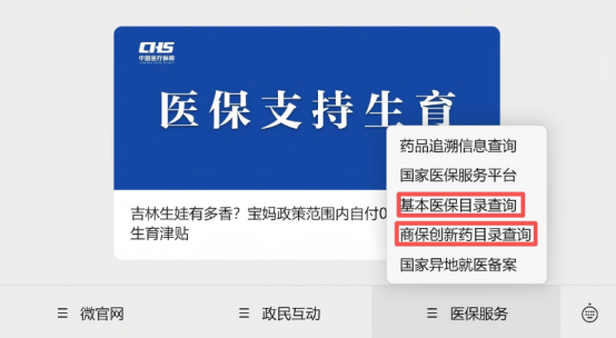 第一步: 进入“国家医保局”微信公众号,点击菜单栏“微服务”→ 选择“国家医保药品目录查询”或“商保创新药目录查询”,进入相应查询页面。